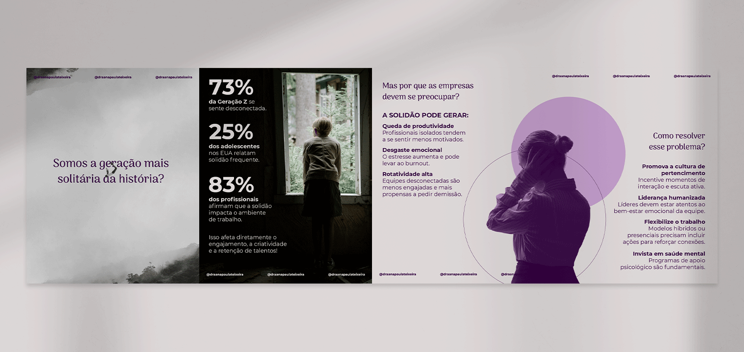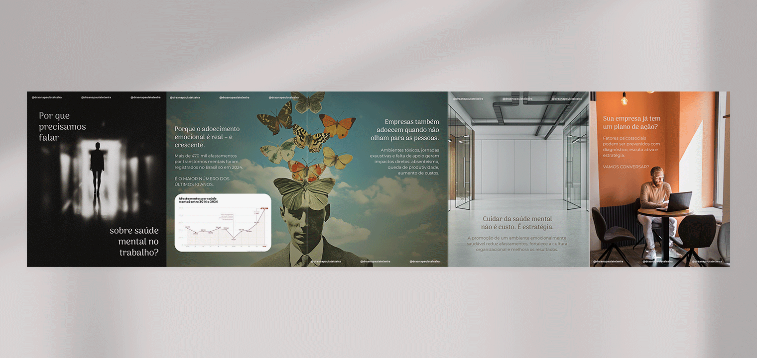 A estratégia de conteúdo foca em evidenciar a especialidade da Ana, sua autoridade no mercado e a importância do cuidado emocional dentro das empresas. Tudo isso de forma clara, acessível e com propósito.