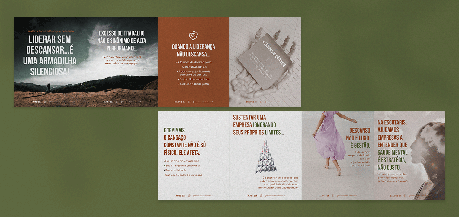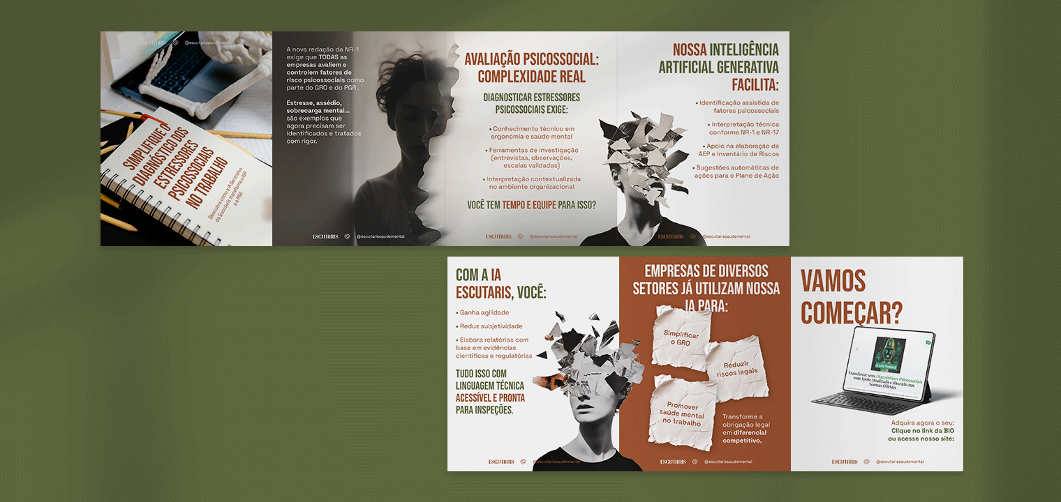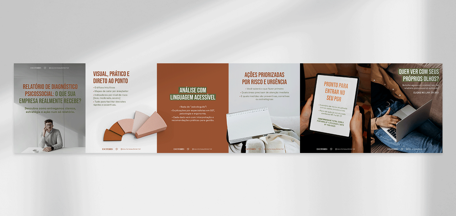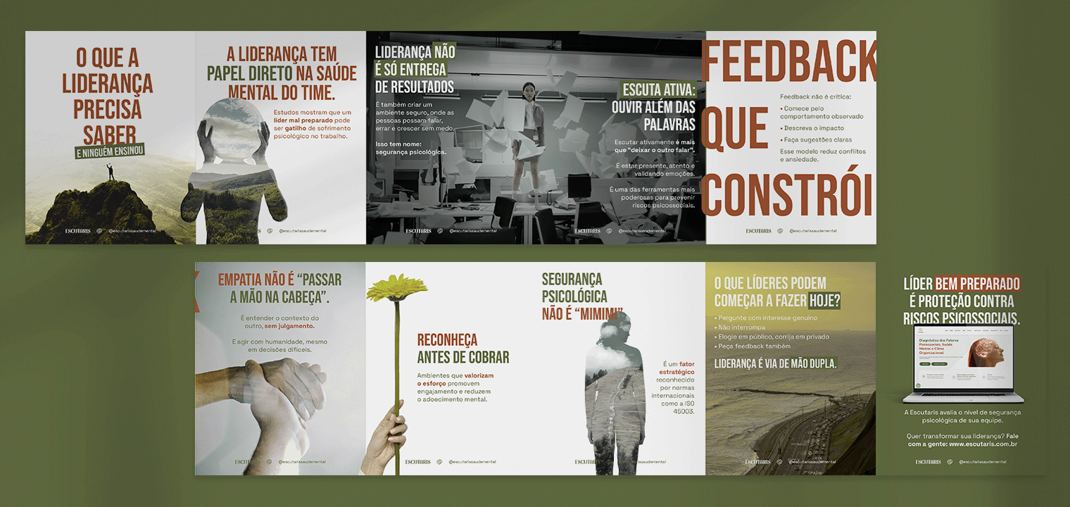 The social media strategy focused on educating the public about the impacts of psychosocial factors in the workplace, demystifying NR-1 and valuing the role of leaders in this process. The content was designed to position Escutaris as an authority on the topic, but in a simple, humane, and educational way—with posts that inform, engage, and generate value for companies that truly care for their people.
