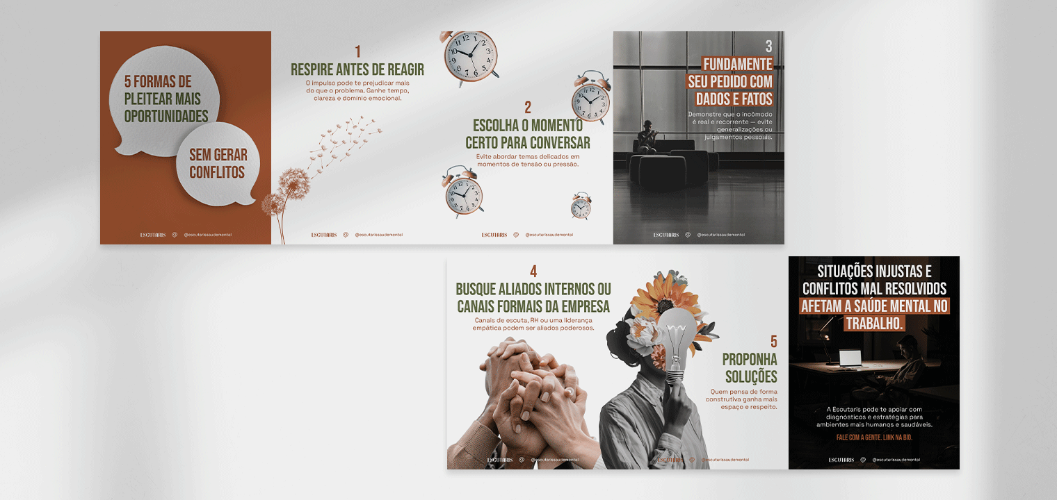 Na estratégia de social media, o foco foi educar o público sobre os impactos dos fatores psicossociais no ambiente de trabalho, desmistificando a NR-1 e valorizando o papel dos líderes nesse processo. O conteúdo foi pensado para posicionar a Escutaris como autoridade no tema, mas de forma simples, humanizada e didática — com posts que informam, envolvem e geram valor para empresas que querem cuidar verdadeiramente das suas pessoas.