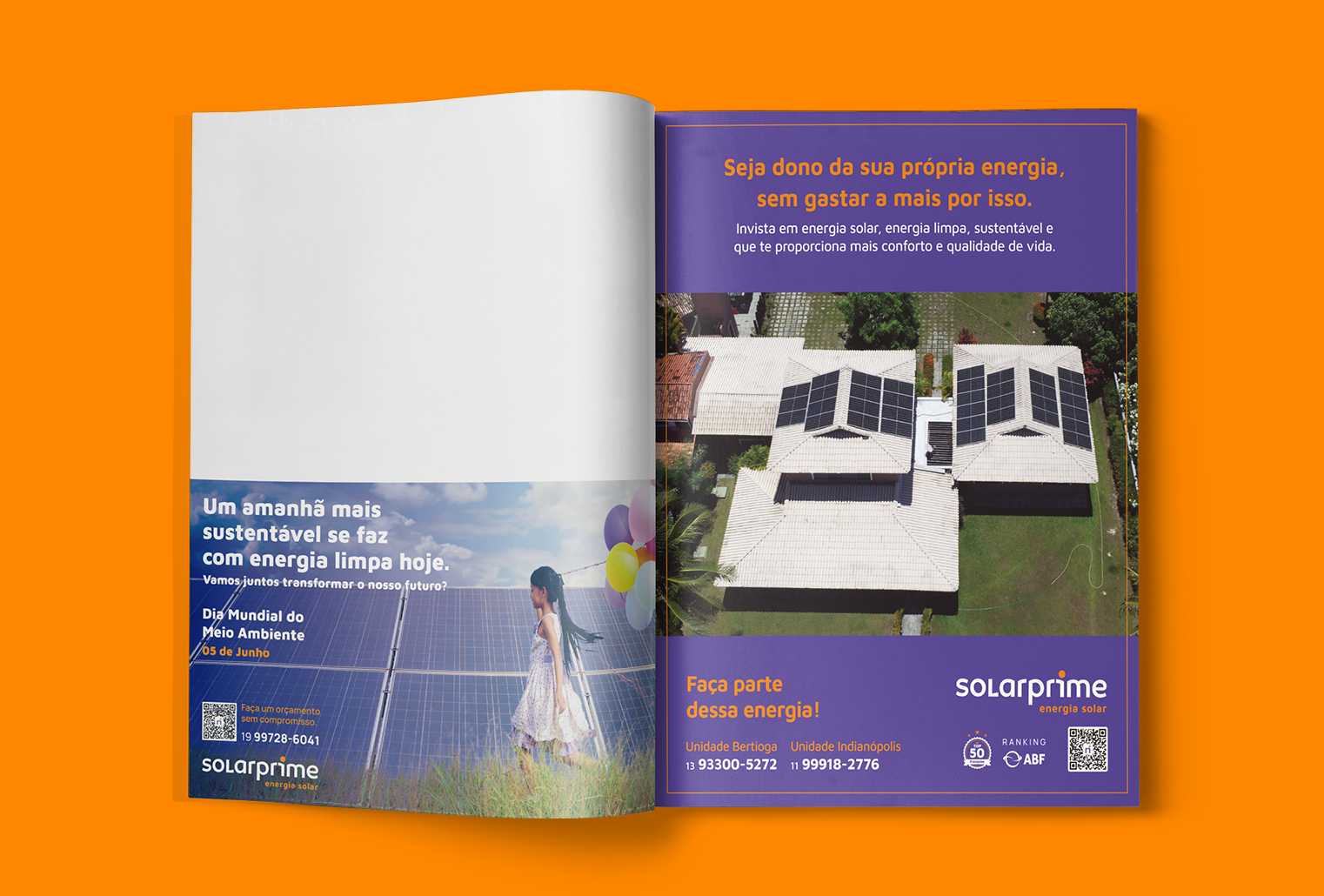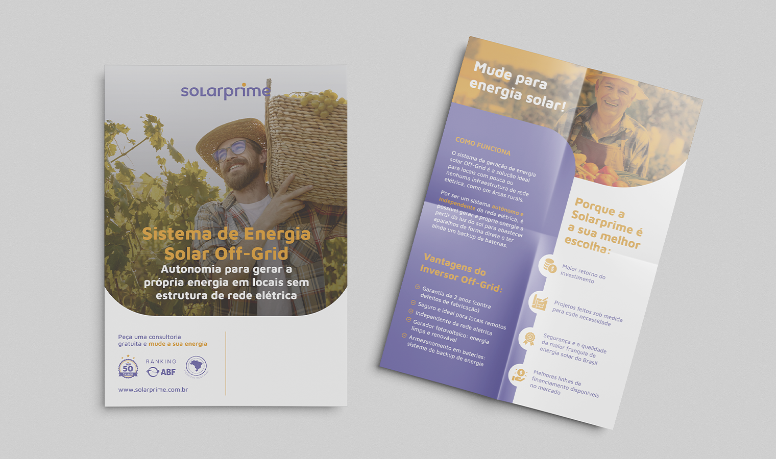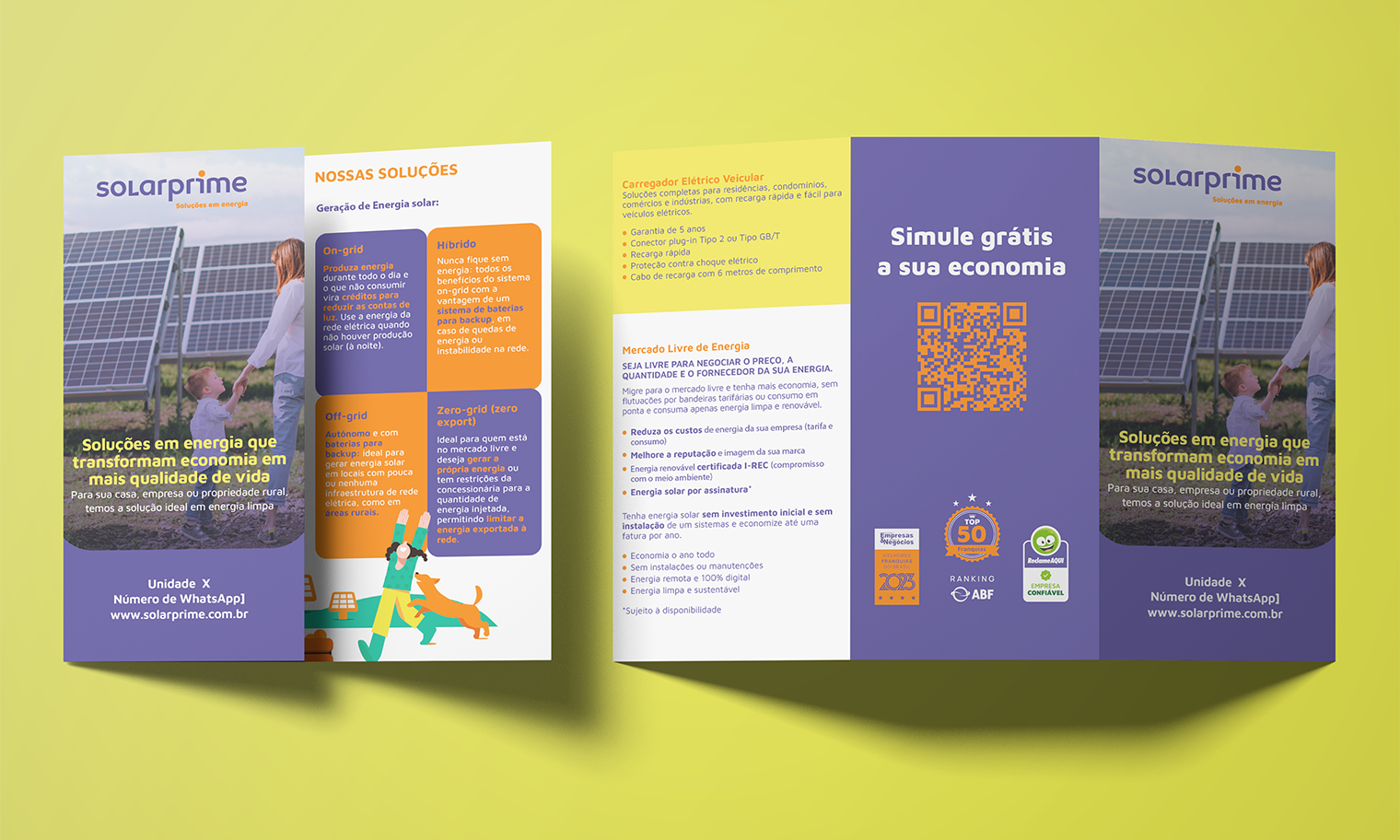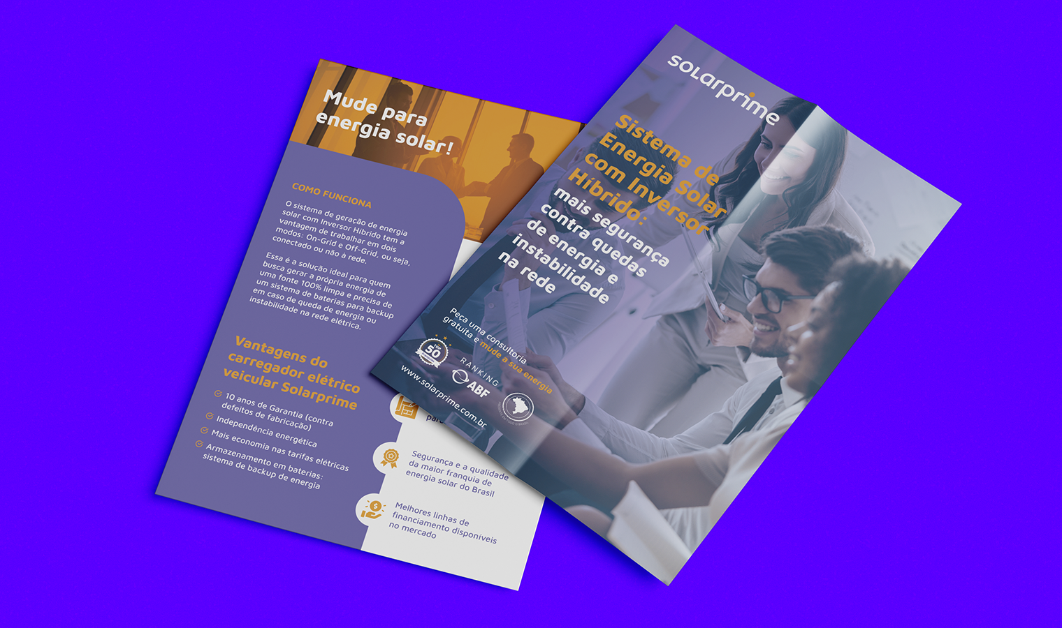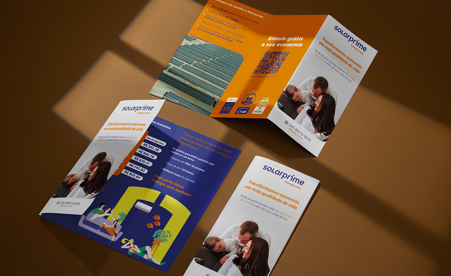 O desafio foi desenvolver materiais impressos que transmitissem informação de forma clara, atrativa e alinhada ao posicionamento da marca. Esses materiais precisavam manter a identidade visual e a estratégia de comunicação já consolidadas pela Solarprime, além de serem versáteis para uso tanto pela matriz quanto pelas franquias em todo o país.